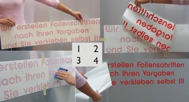 1. Folienschrift auf dem zu verklebenden Untergrund auf einer Seite (hier linke Seite) durch Klebebänder fixieren.